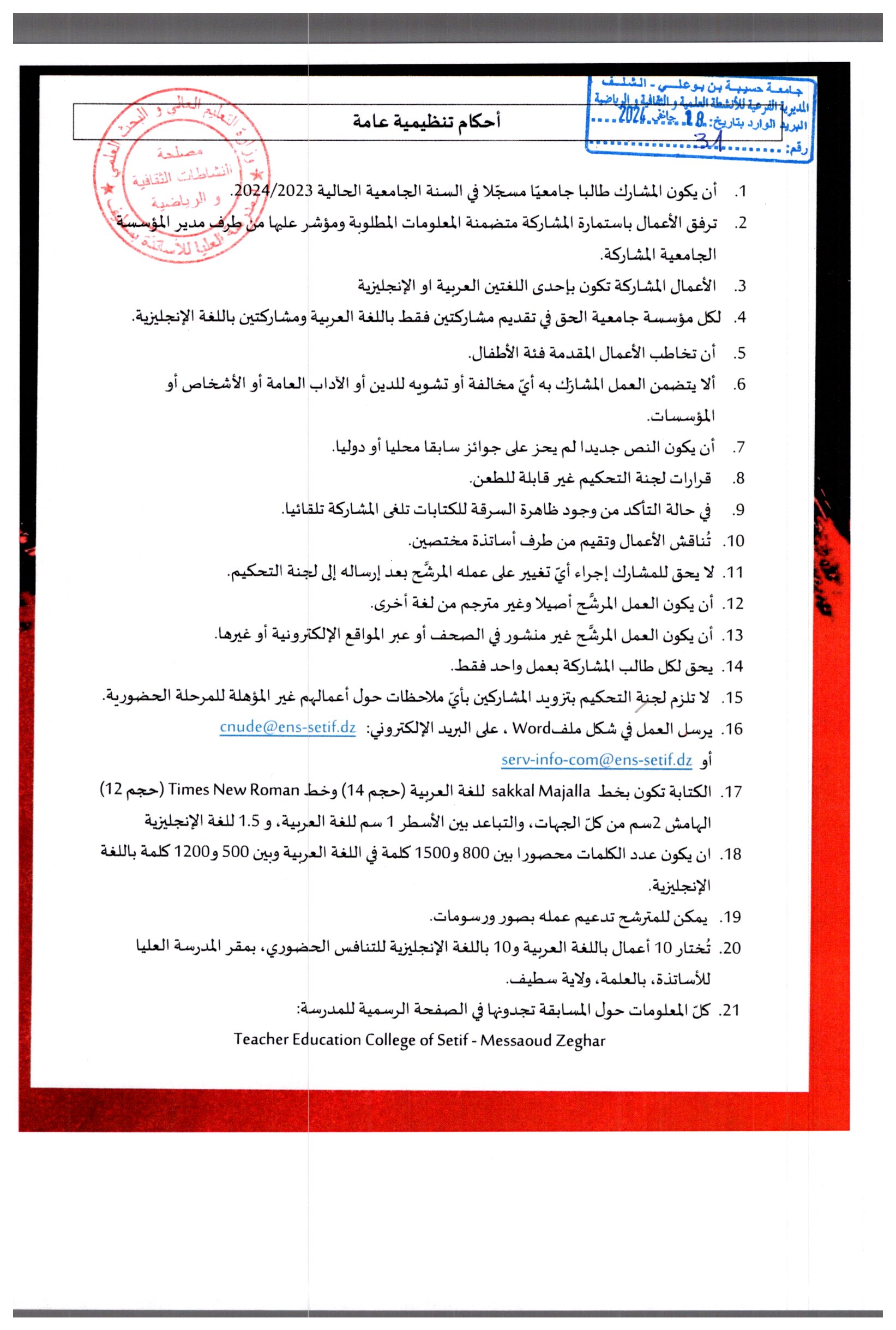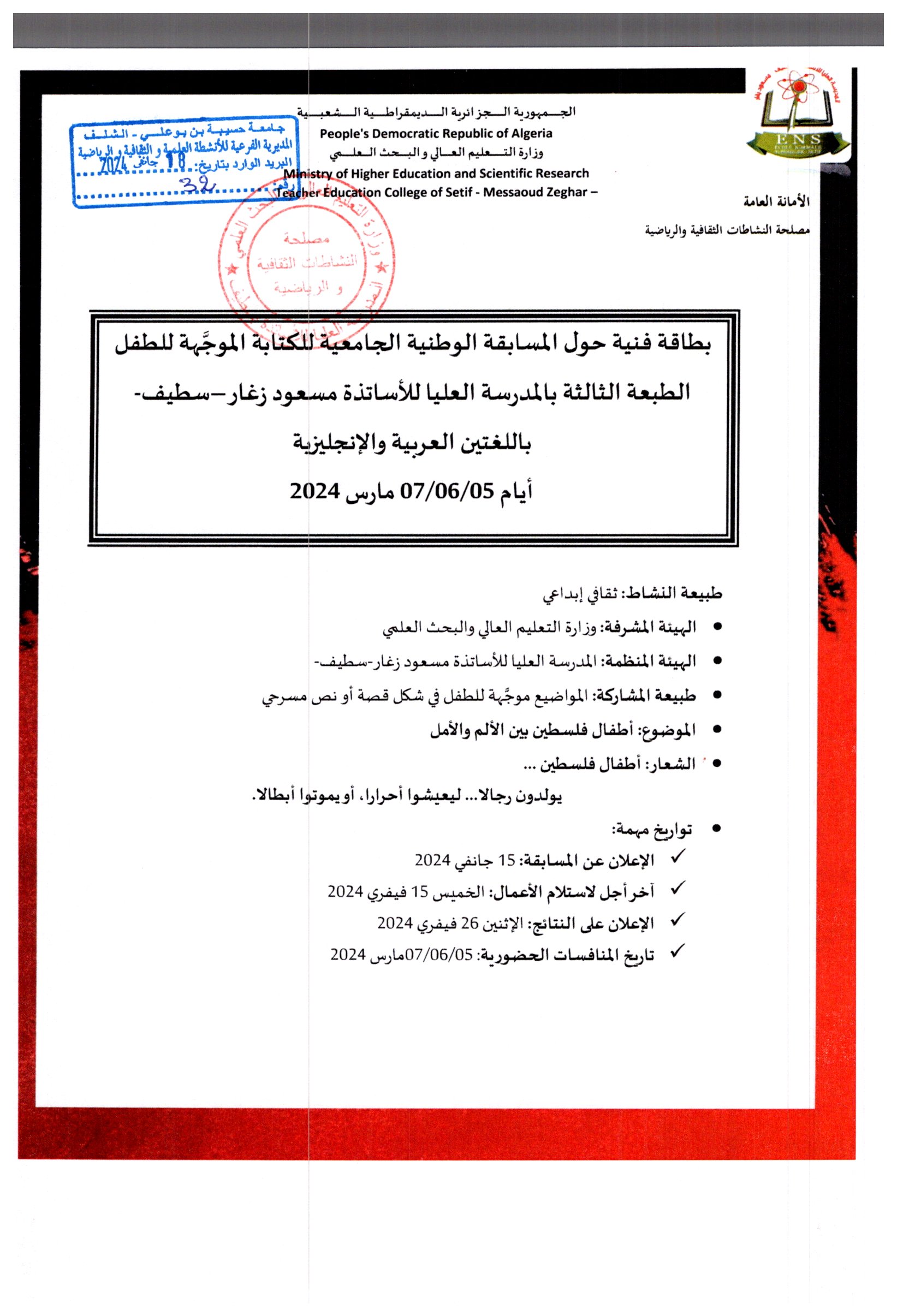 تنظم المدرسة العليا للأساتذة بسطيف الطبعة الثالثة للمسابقة الجامعية في الكتابة الموجهة للطفل باللغتين العربية و الانجليزية 07/06/05 مارس 2024.